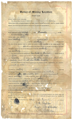 I believe that the paper that I have is one of the original Notice of Mining Location papers that were filled out by the Chittenden and Mellor group as they staked their claims in December of 1902.