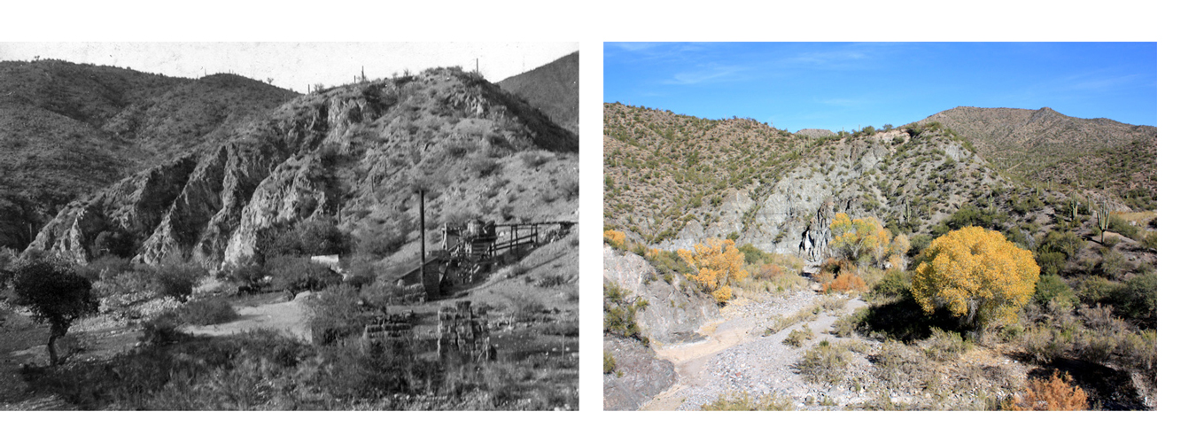 The camp that the Chittenden group worked out of was located on Ash Creek, northeast of Winkelman. The photo on the left is how the camp looked in 1903. The photo on the right is the camp location as it appears today.
