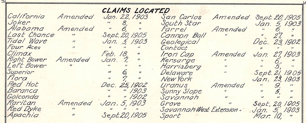 This listing of Christmas area claims, shows the location date of December 23rd 1902 for a "Geolegical" claim. That agrees with the date on the paper in my possession. It is interesting that several other claims were also located on December 23rd. I do not know why the "Christmas" claim is not on the list. Unfortunately, I have lost the source for this listing......