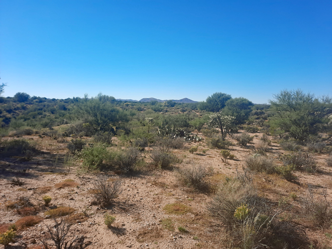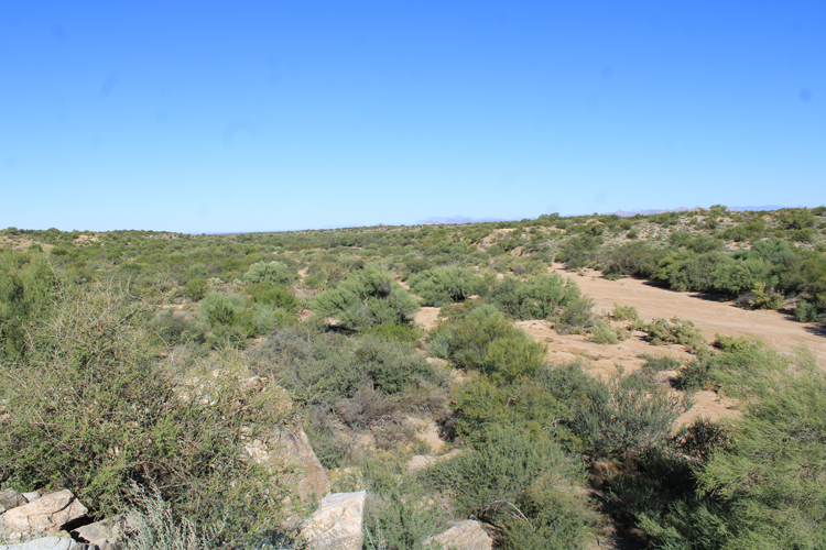 This is the view southwest from the ambush site. Picacho Peak is in a direction over the horizon to the right of the distant hills. That the men who had survived the ambush were able to reach the peak and the other places in that direction, on foot, with no water or other supplies is pretty remarkable.