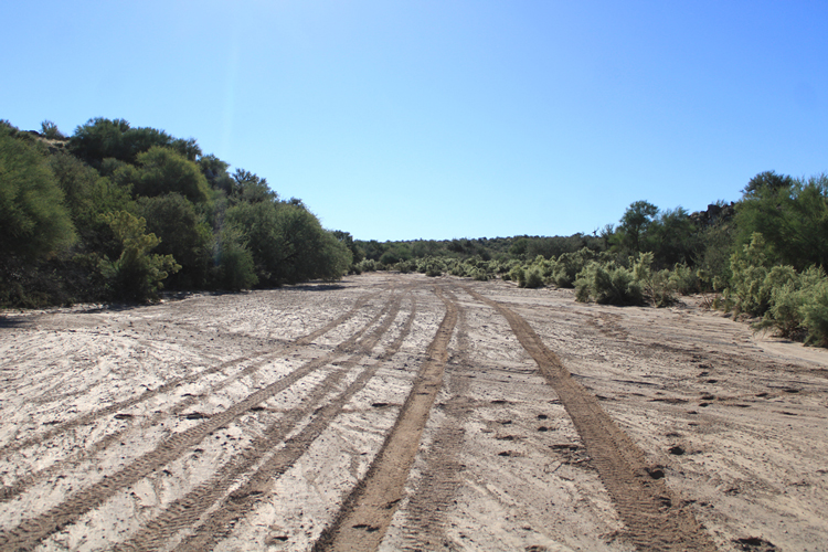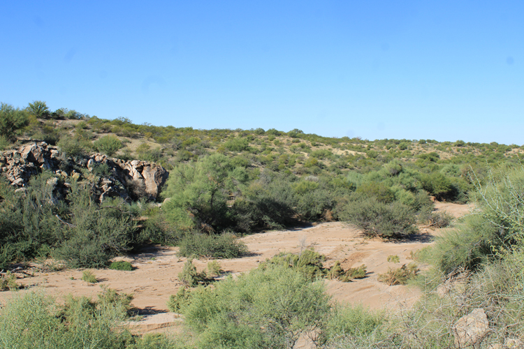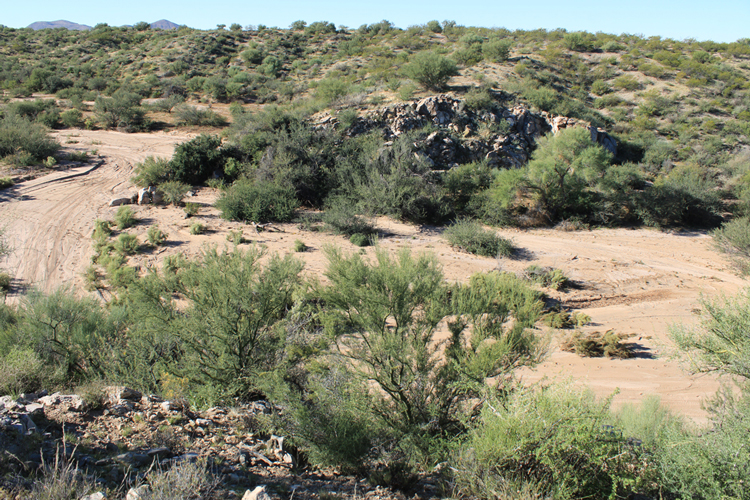 ATV tracks in the wash where the ambush occurred are the only signs of the modern world that occur at the ambush site. There are no roads, mines, water tanks, houses or corrals in the immediate area. Overall, the site could be pretty much like it was during the time of the attack. This is the view looking into the narrow section of Cottonwood Wash that the soldiers would have had just prior to being ambushed.