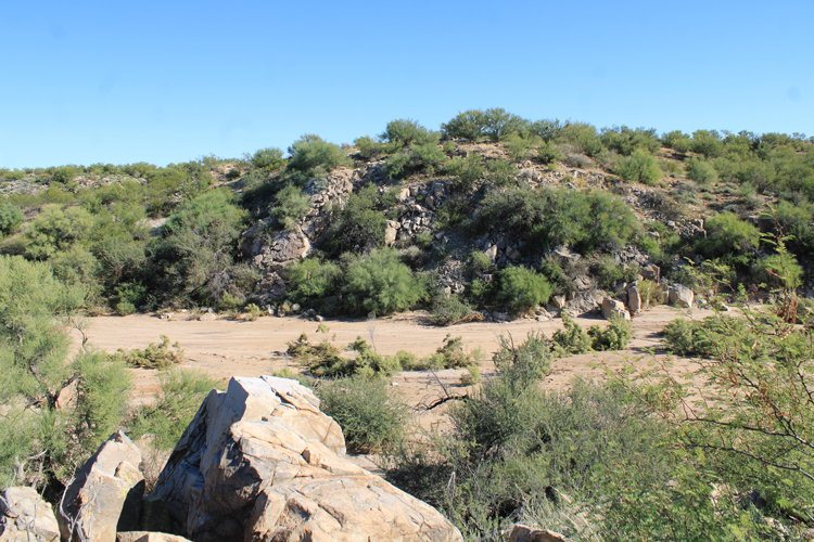 At the site chosen for the surprise attack, the sides of the wash are dramatically closer together than they are upstream or downstream. The wash becomes a narrow gap that runs between two rock formations. This narrow section is approximately 220' wide. From the outcrops, the Apaches had clear lines of sight to fire down onto the unsuspecting soldiers.