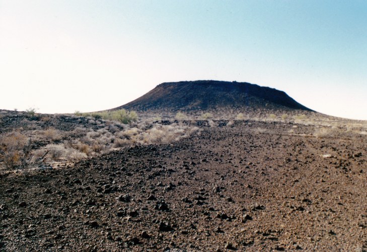 This is Monument Bluff just north of the border. It is one of the cinder cones associated with the Pinacate lava fields. The "bumps" that you see on the rim of the cone are large rock cairns.
