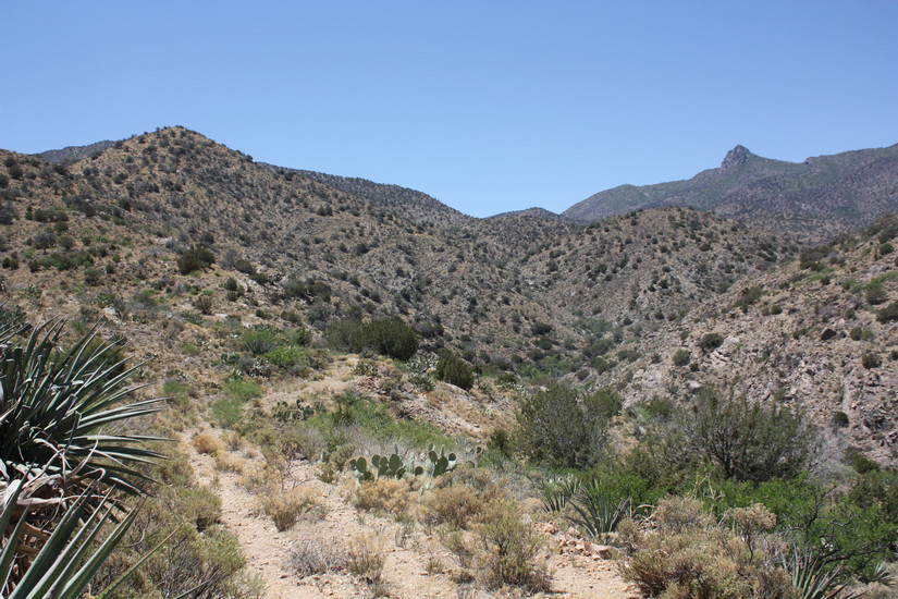 The view south up Buckeye Canyon. One of the Dos Cabeza peaks appears on the skyline. The road has not had much vehicular traffic.