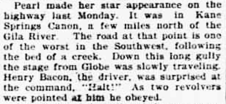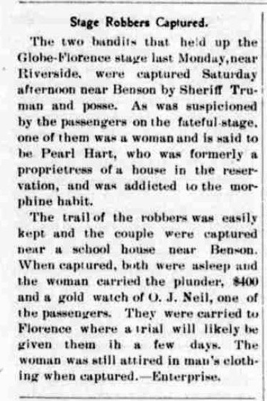 Pearl was Pearl Hart, one of the few women to ever participate in a stage coach robbery. This event attracted so much attention that it is now one of Arizona's most famous and best known outlaw stories. There is more information on this and other similar events farther down the page.