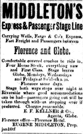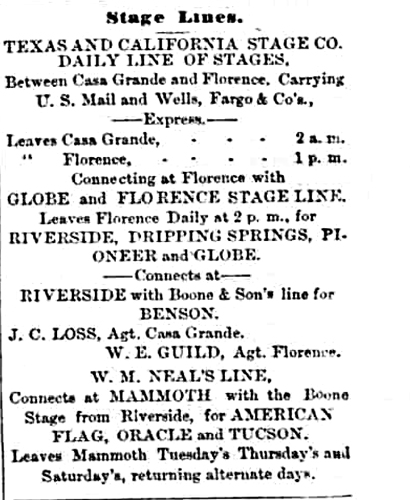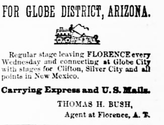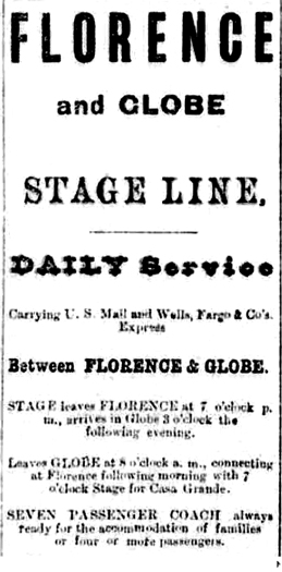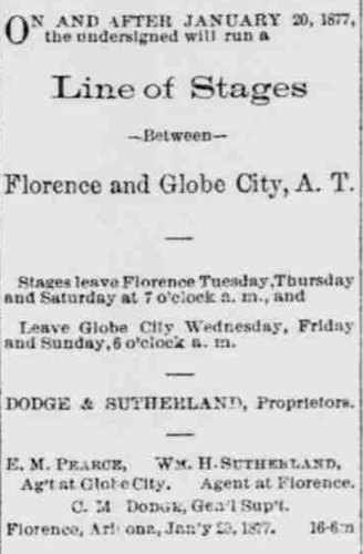 The Florence to Globe road does not seem to have developed into a heavy freight road, but was used more by stagecoach and "fast" freight traffic. Stagecoach operations across the road began in February of 1877. This notice in the Arizona Citizen, a Tucson newspaper, advertised those services.