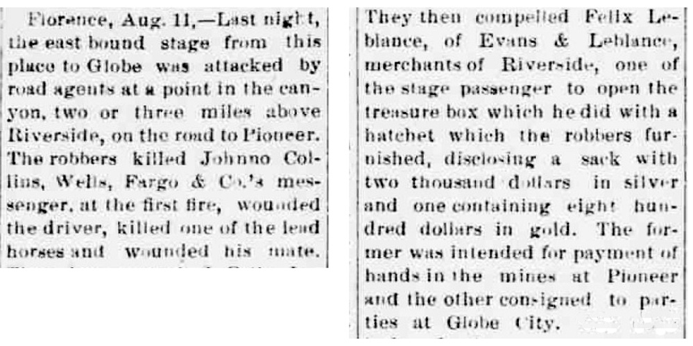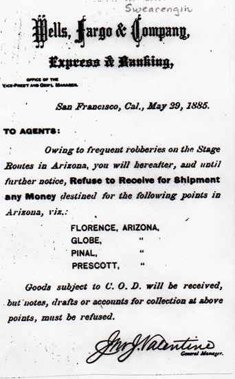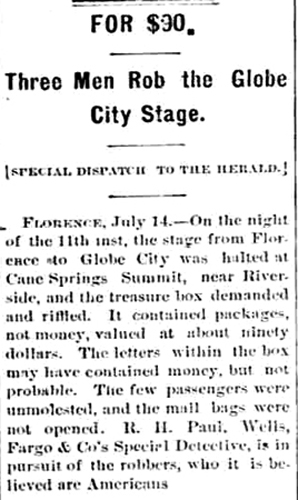 The 1880's and 1890's were a bad time for stagecoach robberies in the Arizona Territory. It was no different along the Florence to Globe Road. In 1885, Wells Fargo issued this proclamation: