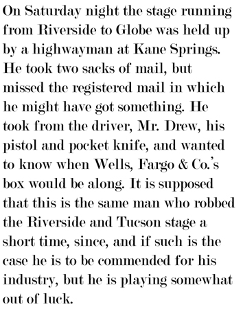 Another stage robbery in 1883 that occurred east of Riverside was more violent. A Wells Fargo messenger was killed and and the stage driver wounded. The robbers were affiliated with the "Red" Jack Almer gang. Several thousand dollars worth of gold and silver were taken in the heist. This news article appeared in the Arizona Sentinel a few days after the incident.