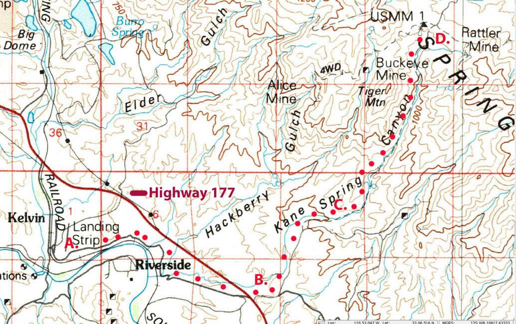 Although I had grown up in Winkelman several miles to the east of Kane Spring Canyon, I had no recollection of ever having been in the canyon. So early in 2016, I headed out that way to see what it was about. My brother in law and I hiked through to the Buckeye Mine west of the old town of Troy. After that trip, I had the chance to look into the history of the road a bit more.