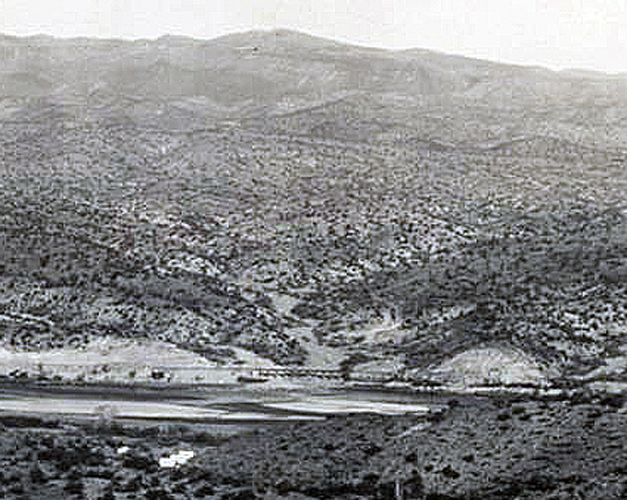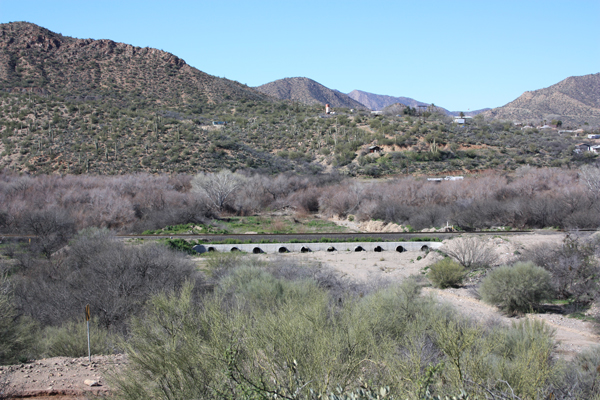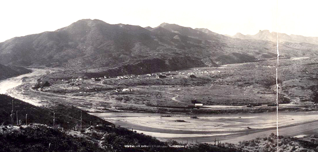 This is the 1908 view from above Riverside across the Gila River towards the mouth of Kane Spring Canyon. The road to Troy can be seen leaving the wash to the right just beyond the trestle.