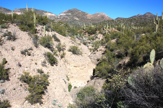 This is the view down the canyon from a hillside north of Kane Spring. The Gila River drainage runs from left to right in front of the mountains in the distance.