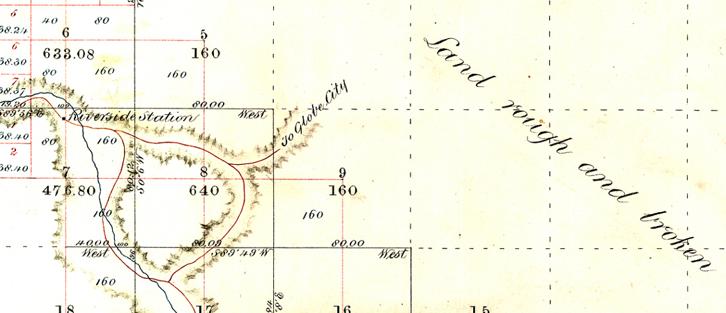 A General Land Office Survey Map of 1880 zoomed in on the area around the Riverside Station. It was located on the westside of the Gila River nearly opposite the mouth of Kane Spring Canyon. In the earliest years, Charles Putnam was the postmaster at Riverside. Federal surveyors would not return to the area and map the "Land rough and broken" until 1908.