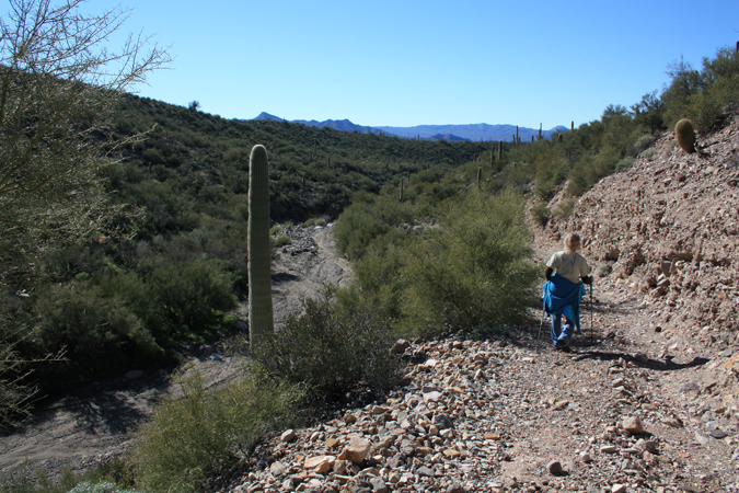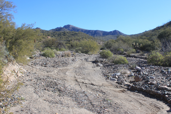 Just upstream from the well-preserved section of road, the route is once again in the wash bottom. Would the stagecoaches have been able to travel the road in conditons similar to this?