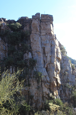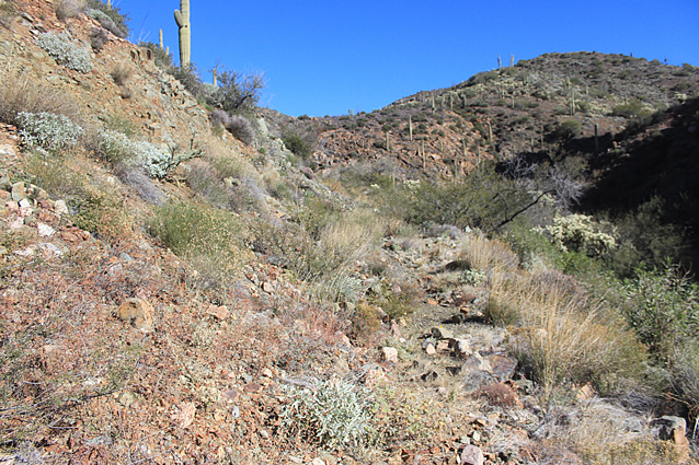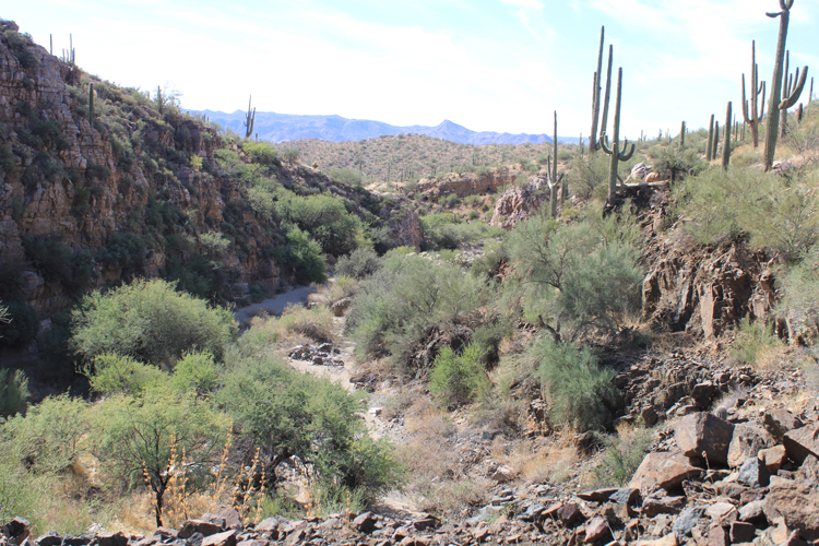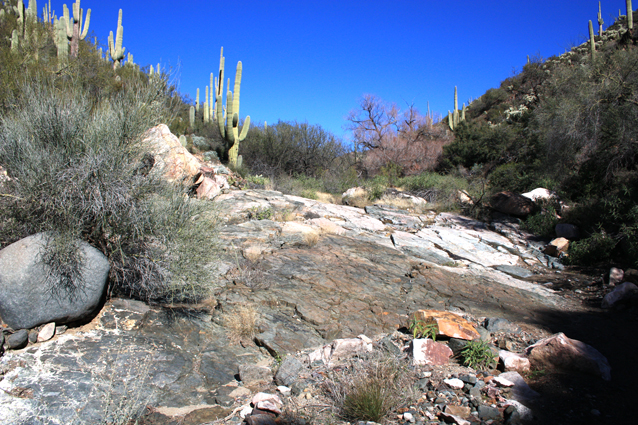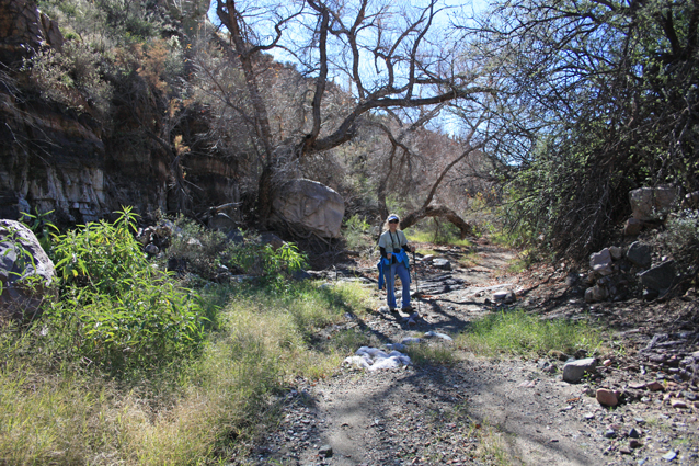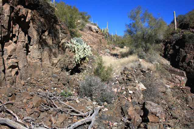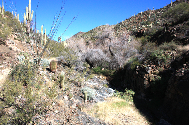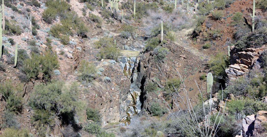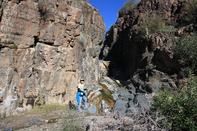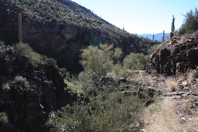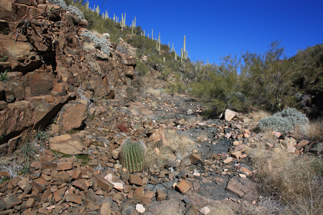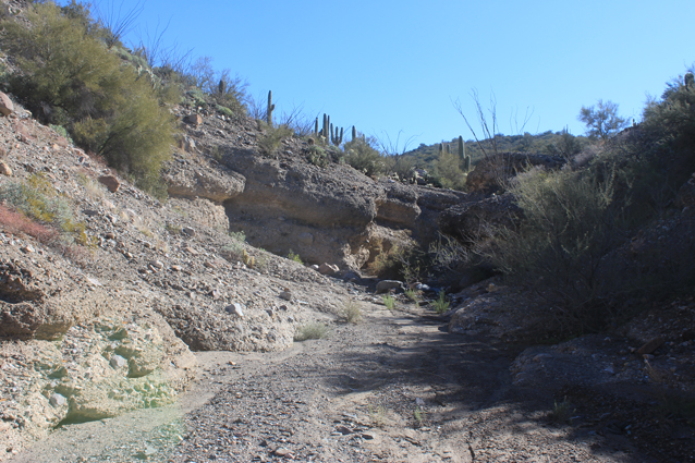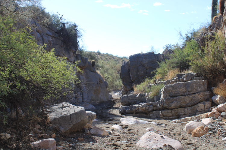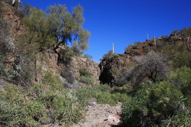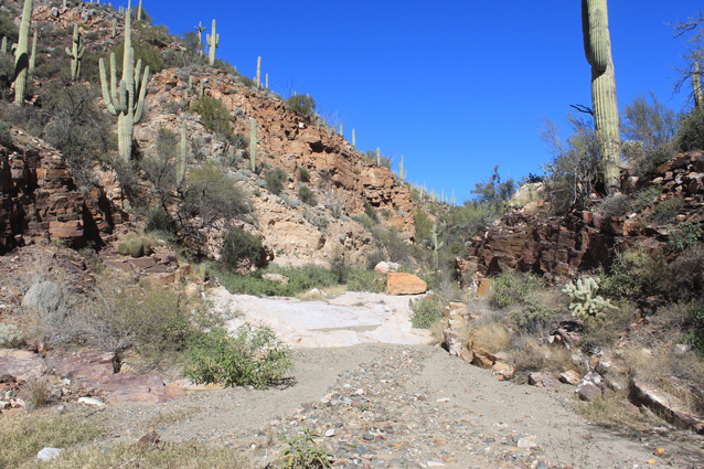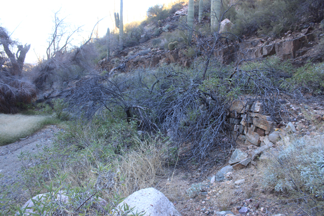 North of the waterfall, an old retaining wall marks the exit from the westside bypass back into the wash.