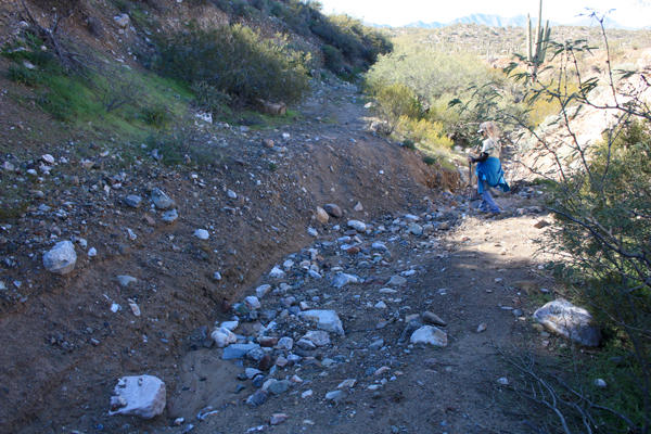 These photos are of the section of road where it has crossed to the north side of the wash in the GE view above. The road was usually much closer to the channel than it was here. There was some excavation required to create this piece of the road bed.