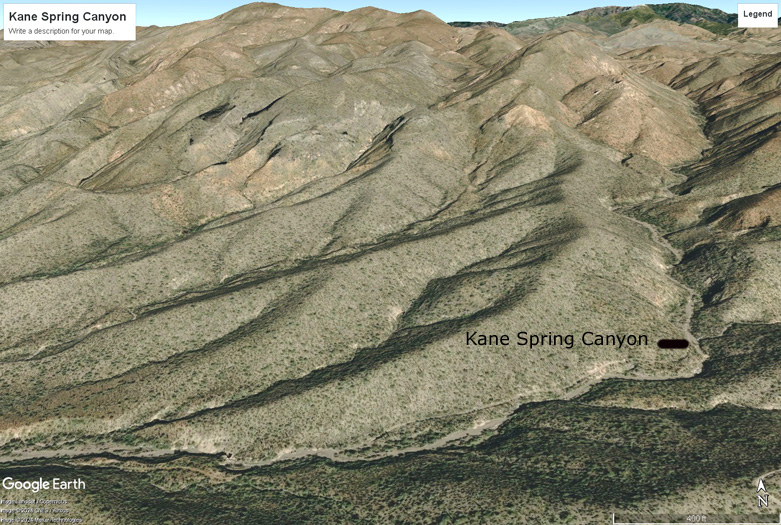 Approximately, 1 mile north of Kane Spring, the road leaves the canyon and climbs up a granite like ridge toward the crest of the mountains. The alignment of this section of road does not match that of the 1910 topographic map. A Google Earth view of this location shows an abandoned section of the road to the west. This is the one section of the road that does not really conform to the road's position as it was depicted on the 1910 map.