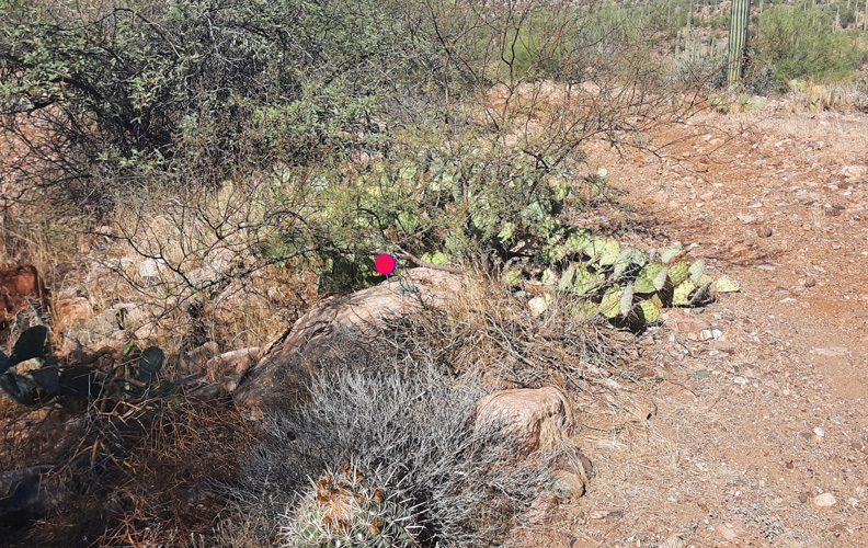 The benchmark identified as BM 2511 on the early 1910 topo map is located in the lower left corner of the photo above near the words "Google Earth". As noted in the description, the marker was located "400 feet west of point where the road crosses the wash". In the photo below, the red dot indicates the location of the benchmark. As it was described in 1909, it is "on southwest side of road......in top of granite bowlder".
