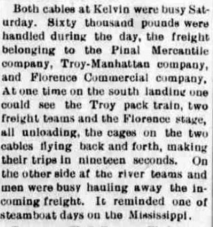 Several newspaper articles in 1905 described improvements in the cable system across the Gila River. Apparently a double cable tramway system had been devised that included at least one "cage" that could carry up to 2000 pounds of freight or four persons and all of their grip.