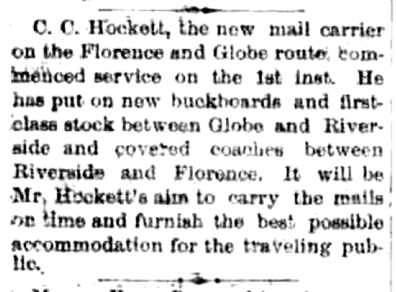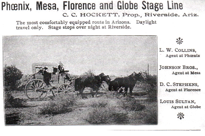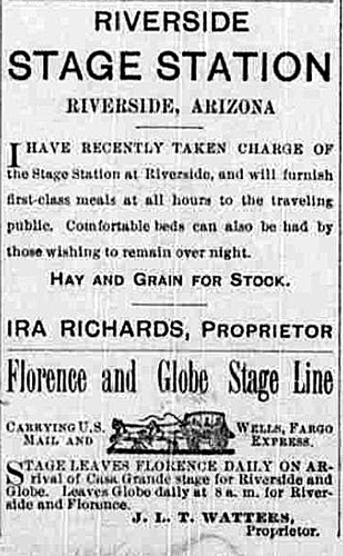 In 1890, a notice in The Arizona Republican identified the Riverside station as a full-service operation. The scheduling of stages between Florence and Globe had improved from a few times a week to daily service.
