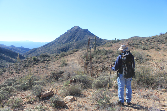 This is the view out to the Mescal Mountains to the northeast. The road cut for highway 77, the modern road to Globe, can be seen just above the pass between the two hills in the foreground. Even though it is not possible to travel over to the actual Troy townsite, the views from the crest near the benchmark justify the effort made to get here.