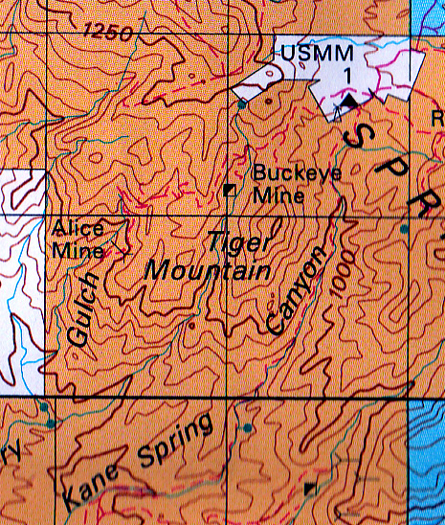 The road in the wash east of letter C. is probably better suited for well-equipped short wheel base 4x4 vehicles. In the canyon east of Tiger Mountain and north of Kane Spring, the road has been closed to vehicular travel. Private property that includes the old Troy townsite is posted against entry.
