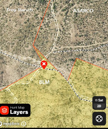 In 2016, we knew that there was private property in the area of the old townsite of Troy. We had chosen not to travel in that direction because we were not certain where the boundaries were between public land and private property. In 2023, we had the use of a navigation program that provided greater detail on the status of the properties along the old road. This screenshot, from the ONX app, identified the private property owners and showed their boundaries. The waypoint marks the location of BM3644. It appeared that the Kane Spring Canyon Road which approached the benchmark from the south was on public BLM lands. It would not be trespassing to travel to the benchmark.