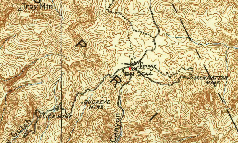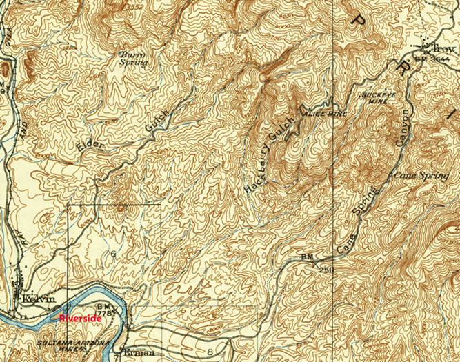 A topographic map that was published in 1910 by the USGS shows the routing of the Kane(Cane?) Spring Canyon portion of the Kelvin to Troy road. There were three benchmarks established to mark the route. Those were BM1778, BM2511 and BM3644.