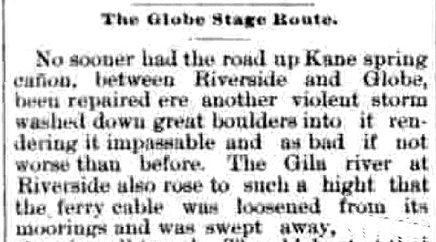 Travel from Florence to Globe City involved a ford crossing of the Gila River at Riverside. Through the 1890's, if the river was flooding, travelers had to either wait it out or turn back. That was not an option for the mail carriers. Several different boats were tried as mail ferries. When those proved difficult to handle in the river currents, a cable was stretched across the river and a mail crate was suspended from it. The crate could hold more than mail. Travelers brave enough could also ride the crate. Apparently, those rides in the mail cart did not always end well. There were several instances in which the occupant ended up in the river.