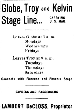 Around 1900, the Riverside station was discontinued and a new station was established on the north side of the Gila River at Kelvin. At the same time, a mining camp, named Troy, was booming on the crest of the Dripping Springs Mountains. It was not long afterward that there was a stage station at Troy. This notice appeared weekly in the Arizona Silver Belt in 1902.