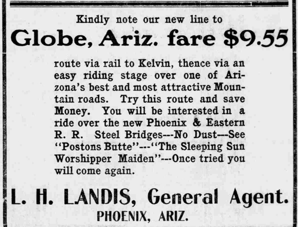 In the summer of 1904, the Phoenix & Eastern Railroad arrived at Kelvin. Stage operators were quick to offer combination rail and stagecoach tickets. The Arizona Republican in 1904 announced this travel opportunity. There may have been some extra enthusiam in the description of the Mountain road.