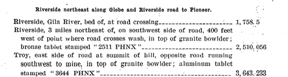 In an index of Arizona benchmarks that was published in 1909, this was the description of the markers. In 2016, I neglected to check on the current status of the benchmarks. In 2023, I thought to do so. Two of the three, BM2511, and BM3644 have survived and are still in place. These benchmarks may have been established as early as 1902.