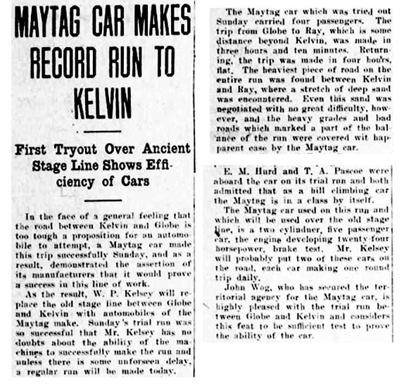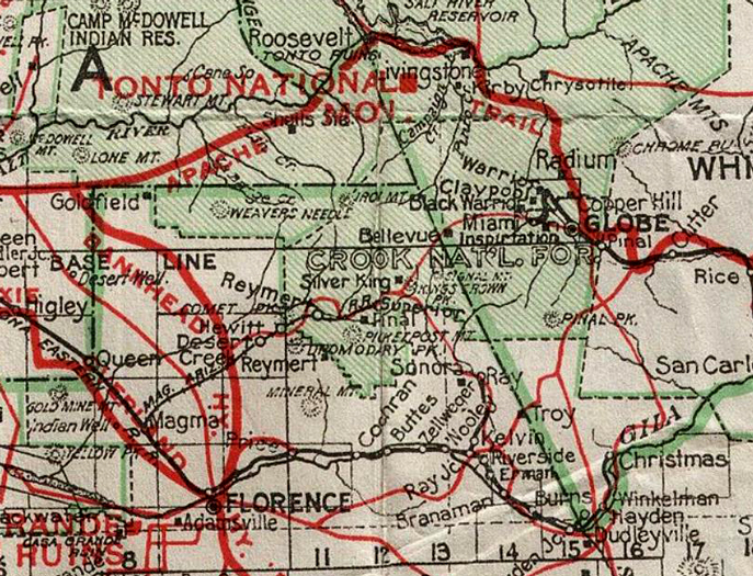 The Arizona Good Roads Association, in 1913, published the first official maps of roads suitable for automobile travel. Included was the route from Kelvin to Globe.