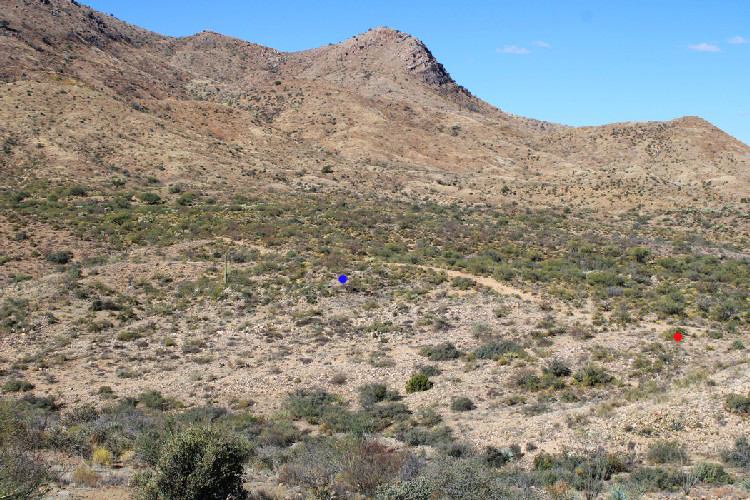 In 2023, This was the view of the town site taken in the same direction as the early photo. The red marker in the photo is at the location of BM3644 and the blue marker indicates the location of the large building in the early photo. The remnants of a building could be seen there.