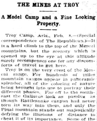Also noted in some of theearly newspaper articles were the scenic views that could be had out from Troy. This was a section of an article published in the Arizona Republican in 1902.