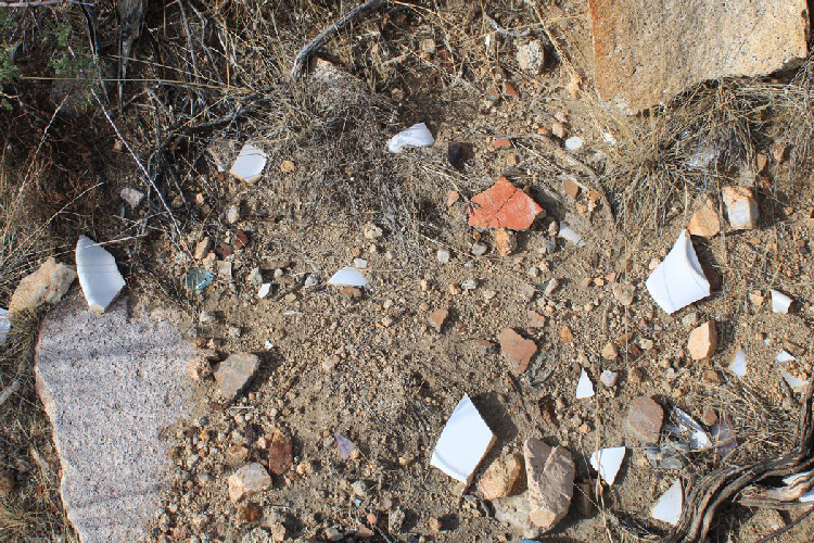 There is an interesting assortment of ceramic type materials in this photo. The white pieces are modern, while the tan pieces looked to be pieces of pottery.