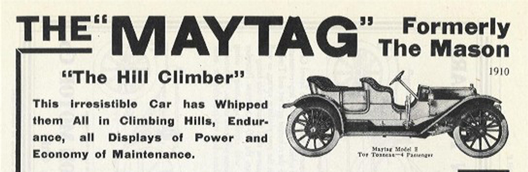 This was an advertisement for the 1910 model year of Maytag automobiles. 1910 was the first year of production of automobiles by the Maytag family. Previously they had manufactured farm equipment and washing machines.