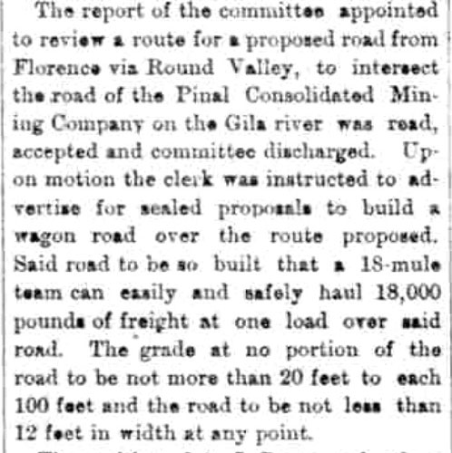 The road through Round Valley was the road identified in the 1892 township survey as the "Road from Gila R. to Cottonwood". Cottonwood was a stage station on the wagon road that connected Florence to Riverside. That station was not far from Round Valley.