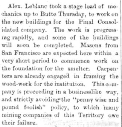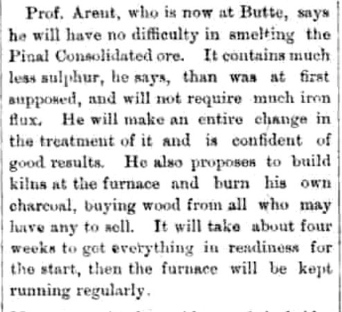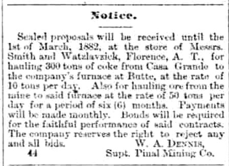 This notice in the Arizona Weekly Enterprise announced that sealed bids were being accepted for the delivery of 300 tons of coke to the Butte Smelter from Casa Grande. The Butte Smelter was not into producing its own coke.