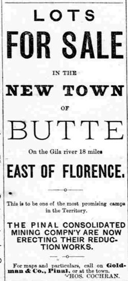 Wagons and mules were the first of the assets to be sold. The Goldman Company, one of the businesses at Butte, moved to the Phoenix area. In 1886, the post office was closed. A new owner did re-open the mines in Martinez Canyon, but the smelter equipment stood idle until it was sold in 1888. The furnace and the smelter building were eventually removed in the summer of 1889 and were taken to a new mine south of Casa Grande.