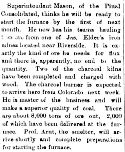 In its September 9, 1882 issue, the Arizona Weekly Enterprise announced that the company would be getting back into the smelting business. Charcoal Kilns would be built at the furnace site.
