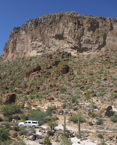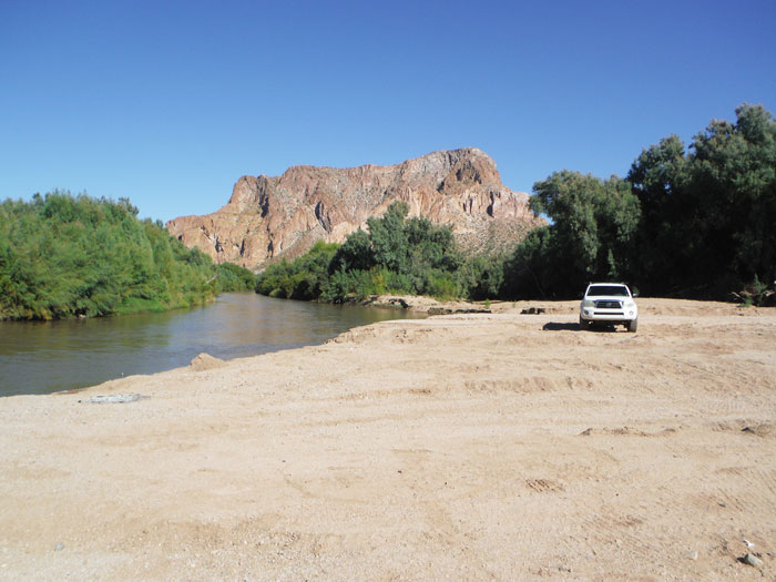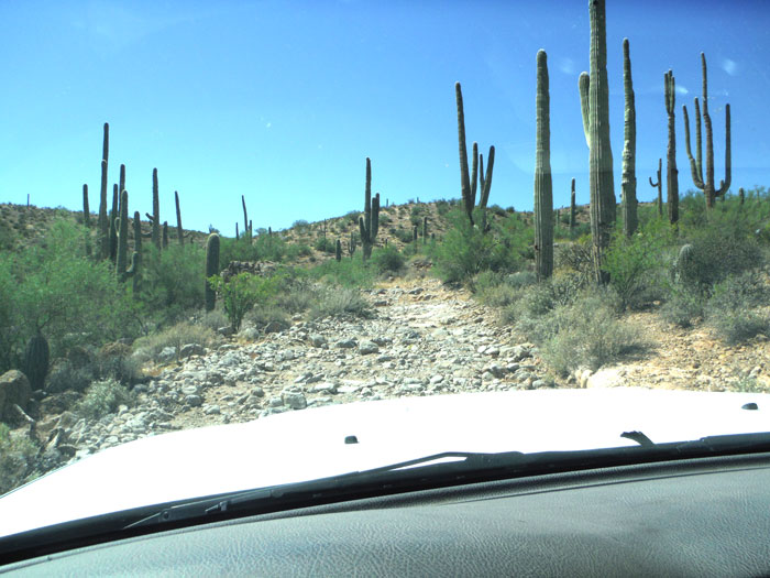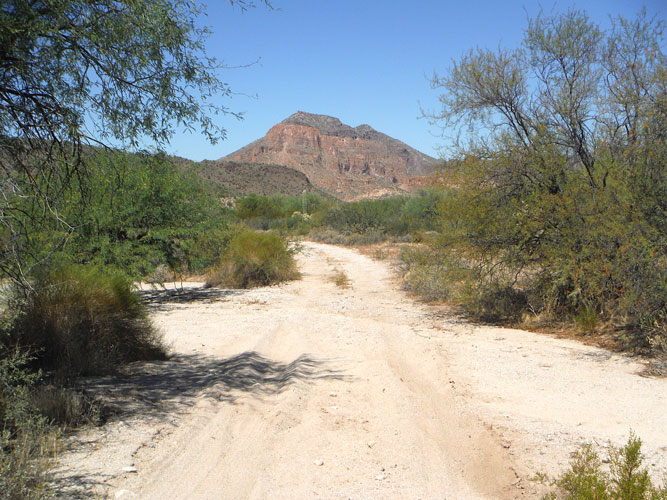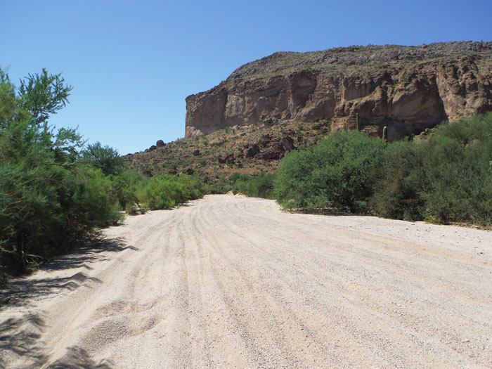 At N33° 05' 07.31" and W111° 10' 26.44", the road leaves the wash and climbs up onto a rocky ridge to continue on towards the river.