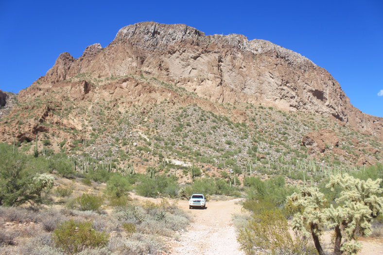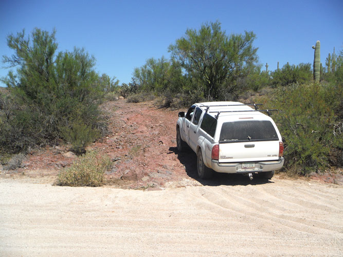 I was able to backtrack to a faint trail just west of Big O Wash and follow it out to the Whitlow Ranch Road near Waypoint F. The co-ordinates for the turn west of the wash are: N33° 05' 5.11" and W111° 13" 13.25". The co-ordinates for Waypoint F are: N33° 04' 38.14" and W111° 14' 33.01". This ranch road was not on the original route from the diversion dam. From Waypoint F, it is approximately 7-8 miles south on the Whitlow Ranch Road to the Florence-Kelvin Highway.