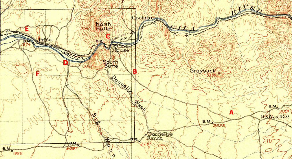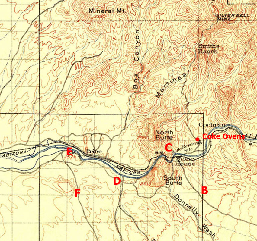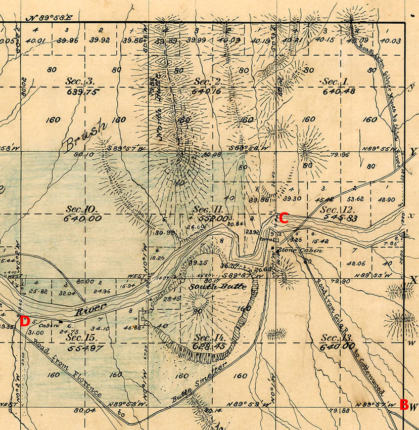 The rectangular grid that overlays the area of the Stone House on the map above is the outline of a Township Survey that was done in 1892. The northeast quadrant of that grid is shown below. Here, the rock ruin is labeled as the "Stone Cabin". The roads nearby have been identified. Segment B-C was the "Road from Gila R. to Cottonwood" and the segment C-D was the "Road from Florence to Butte Smelter". A 3rd road was the "Road from Silver Mines to Gila River".