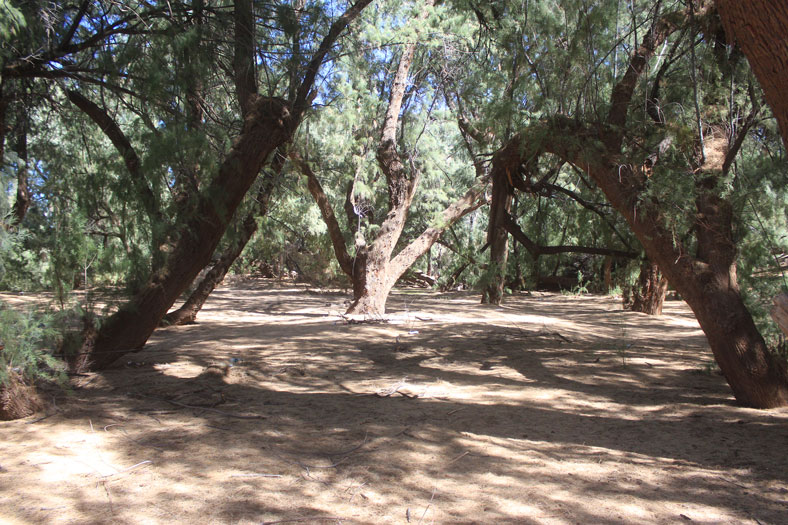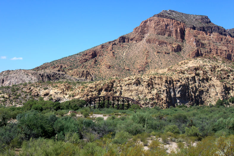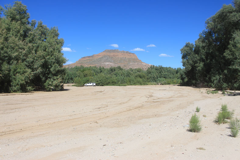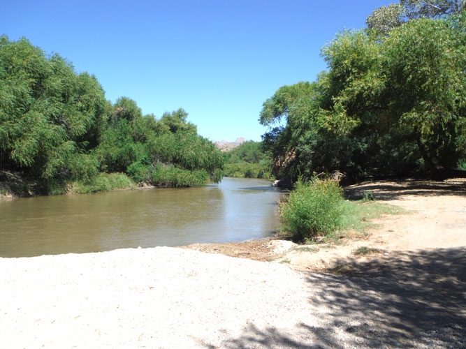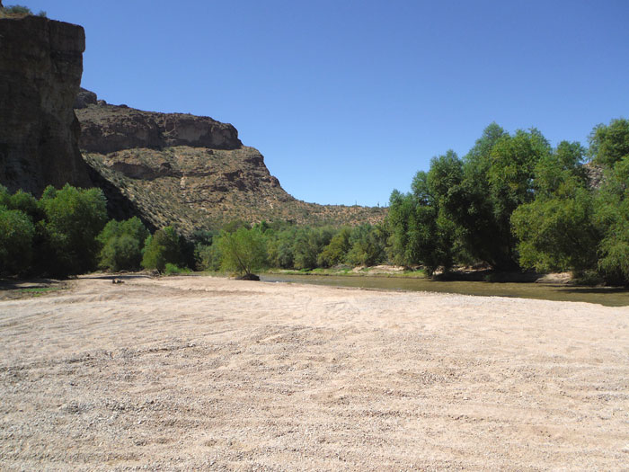 The previous photo of the beach on the Gila was taken with the view downstream. This is the upstream view. When water levels are very low, it is often possible to enter the river bed here and drive upstream to pass under the railroad bridge.