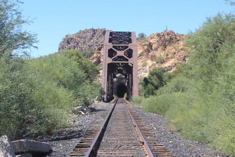 The access roads to the mines and the smelter north of the river were cut off in the early 1900s when the railroad tracks to Kelvin were laid down. Access to those areas is now from farther west or down from the north. Perhaps to discourage "track jumping", other barriers have been installed along the railroad to keep vehicles away.