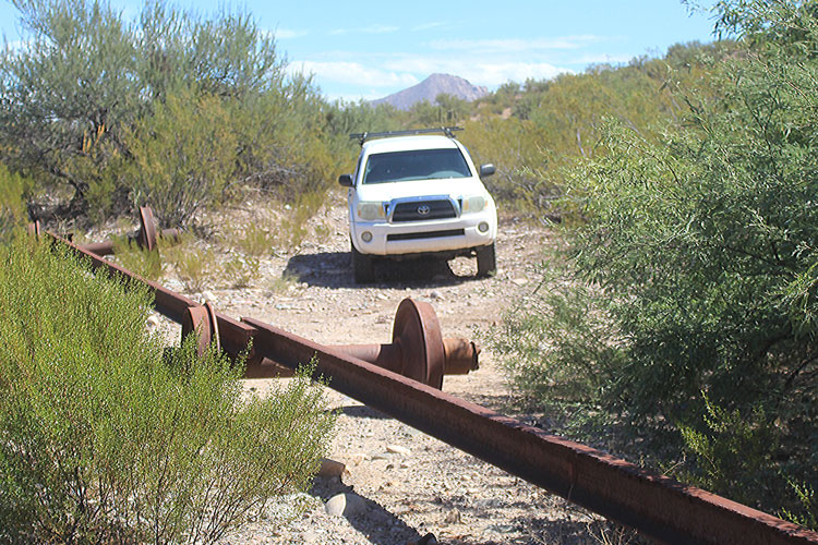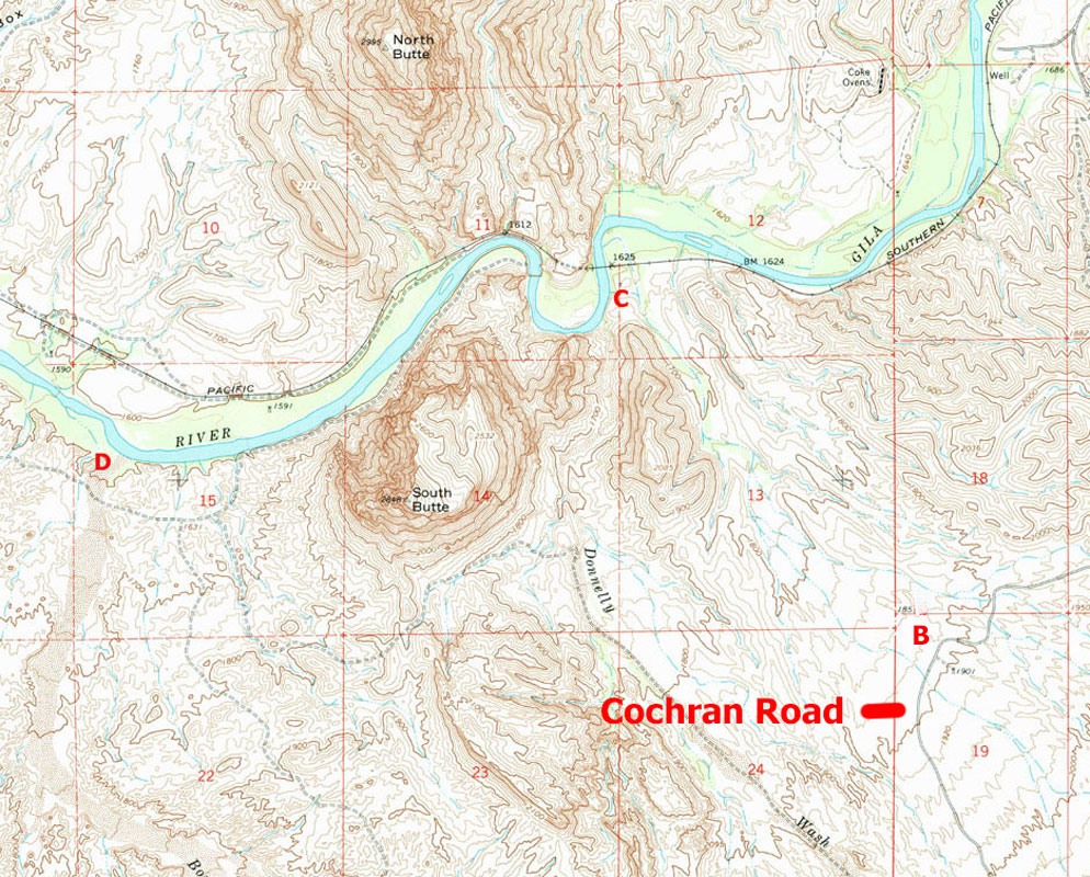 The first leg of the trek on the old roads that once serviced the Butte Smelter and the mines beyond, begins where the "Gila River to Cottonwood" road crosses the Cochran road approximately 8 miles north of the Florence/Kelvin highway. This is at Waypoint B. The gps co-ordinates at the turn are: N33° 04' 26.40" and W111° 09' 41.68". A windmill and corral are across the Cochran Road from the turn onto the old route.
