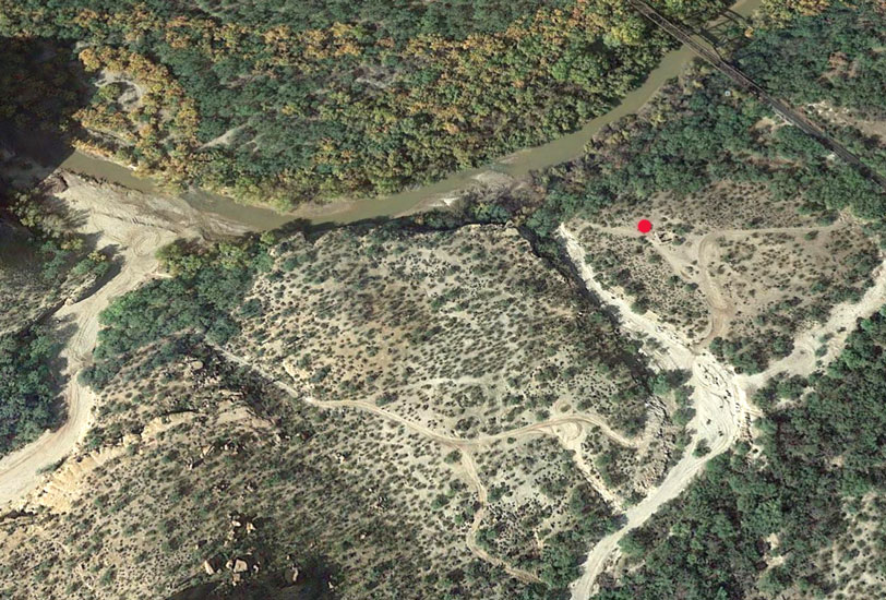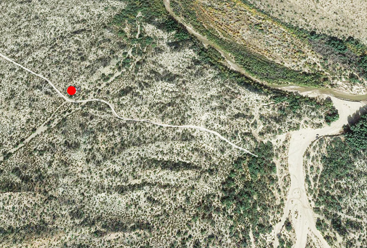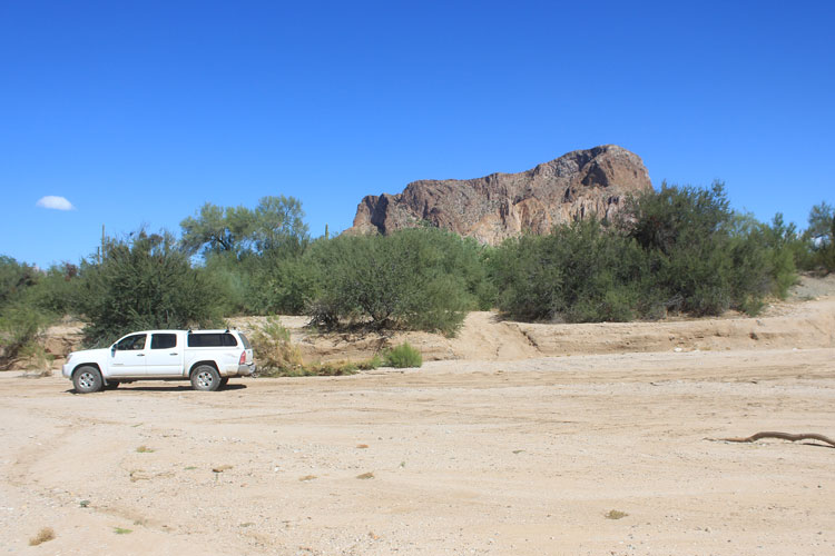 This Google Earth view of the Gila River at the mouth of Big O Wash shows the continuation of the old road to the west of the wash. In the past, it has been possible to continue on to the Diversion Dam at Waypoint E and then travel to the southwest into Florence. On my most recent trip, I found the vegetation along those sections of the road near the river to be too dense and overhanging for my Tacoma. ATVs may not have an issue. If the attempt is made to drive to the diversion dam, be aware that the dam has been fenced off and it no longer possible to access that immediate area.