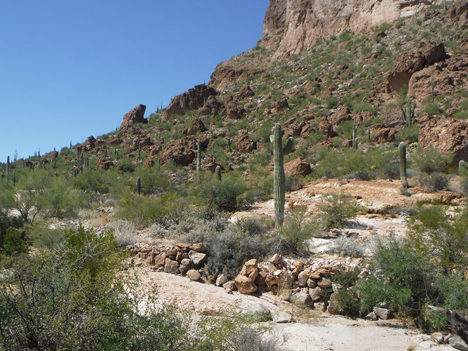 The handwork that was involved in the construction of the old road can be seen along the way. A rock retaining wall at the edge of this wash, still keeps flood waters away from the road bed.