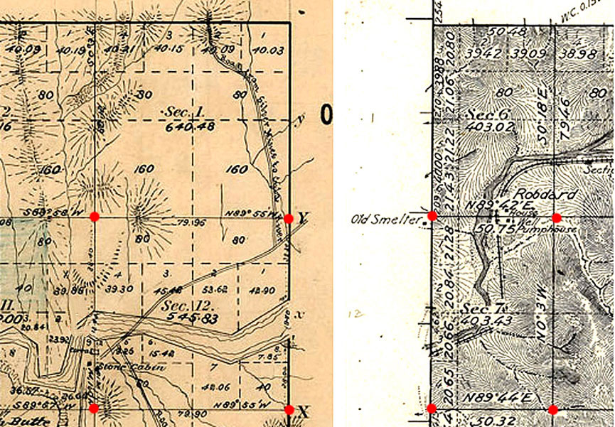 In the photo below, the image to the left is from the 1892 survey. The image to the right is from the adjacent survey to the east which was done in 1926. An "Old Smelter" was identified in the margin of the 1926 map. If the edges of the two surveys are placed together, the old smelter would be located inside Section 12 on the 1892 map near the intersection of the "Road from Silver Mines to Gila River" and the Butte Smelter Road. I think that the "Old Smelter" was a reference to the Butte Smelter.