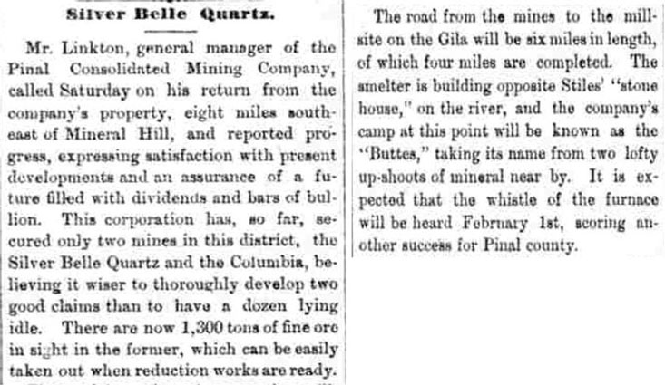 By July, things were not so rosy. The smelter had been shut down. Other newspaper articles noted that the company contracted to provide the charcoal for the furnace had not been able to deliver. The charcoal was not used as a fuel, but was a necessary ingredient in the furnace to ensure the reduction of the silver ore. Sacks were then ordered, and the raw ore was shipped to Casa Grande. From there, it was transported by train to smelters near San Francisco.